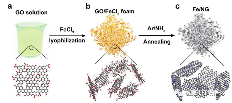 图1 Fe/NG催化剂的合成过程的示意图。a)去离子水中的GO悬浮液,B)通过冻干工艺由GO获得的Fe/NG前体泡沫,和c)通过Ar/NH3退火工艺在650-800 ℃下获得的最终Fe/NG产物。