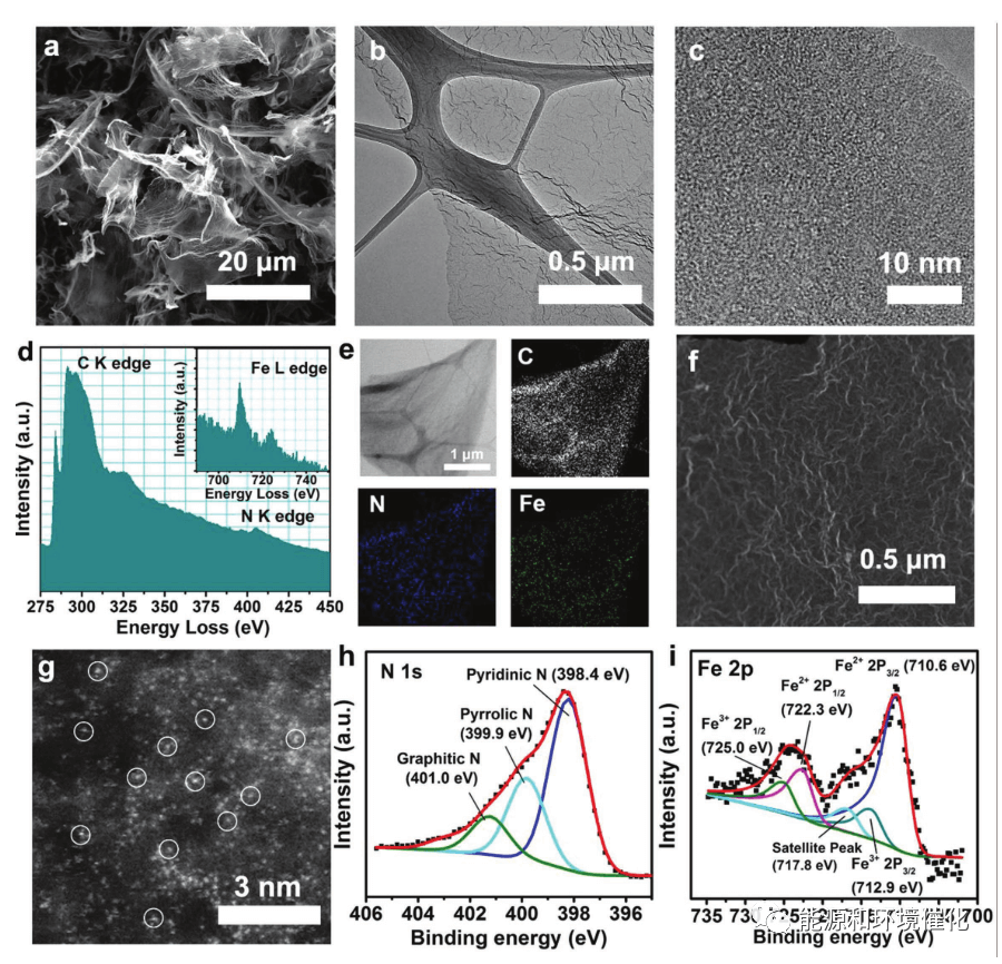 图2. Fe/NG-750的物理和形态表征。a)Fe/NG-750催化剂的SEM图像。b,c)Fe/NG-750催化剂的TEM和HRTEM图像。d)标记了Fe/NG-750的电子能量损失谱(EELS)原子谱,C K边、N K边和Fe L边(插图)。e)Fe/NG-750催化剂的STEM图像和EDS绘图。f,g)分别为Fe/NG-750催化剂的低和高放大倍率像差校正的HAADF-STEM图像。代表一些孤立的Fe原子的亮点用圆圈突出显示。h,i)分别为N 1 s和Fe 2 p3/2峰的高分辨率XPS谱。