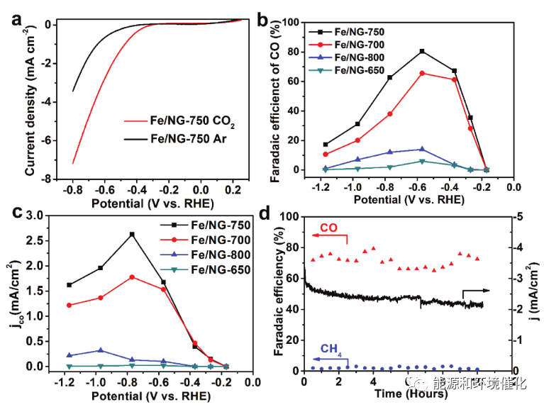 如图3a所示,当电位扫描到比可逆氢电极(RHE)负的-0.30 V时,还原电流急剧上升,表明Fe/NG-750催化剂上CO2还原的过电位较低。相反,在Ar饱和的0.1 m KHCO3电解质中观察到具有显著电流增加的起始电位,其源自析氢反应(HER),因为氢是检测到的唯一产物。此外,在Ar吹扫期间,在-0.80 V(vs RHE)下,CO2饱和电解质中的Fe/NG-750表现出比HER高大约两倍的电流密度。特别是对于Fe/ NG-750,在−0.60 V(相对于RHE)下,对CO的最大FE为80%(图3b)。在向Fe/NG-750催化剂施加更高的过电位的情况下,FE和CO产生的部分电流密度都逐渐下降,因为当在电极表面上检测到H2析出时,竞争性HER变得占主导地位(图2b),这也与图3a中的LSV结果一致。