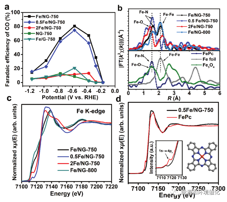 图4 催化活性和XAFS研究对Fe部分的依赖性。a)在与Fe/NG-750相比的不同条件下制备的Fe/NG对照样品的情况下,用于电化学CO2还原的CO的FE。B)Fe/NG对照样品沿着FePc、Fe箔和Fe3O4参比样品的实验Fe K边缘EXAFS光谱的傅里叶变换幅度。c)Fe/NG对照样品的归一化Fe K边缘XANES光谱。d)0.5Fe/NG-750催化剂(黑线)和FePc参比物(红线)的归一化Fe K边缘XANES光谱;插图显示边缘前特征的放大视图。