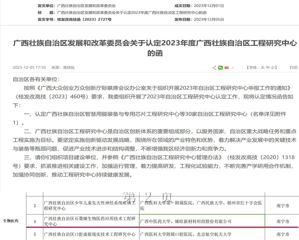 近日,广西壮族自治区发展和改革委员会公布了2023年度广西壮族自治区工程研究中心认定名单,烯旺科技与广西中医药大学于2017年共建的“石墨烯生物医药应用技术研究院”——正式授予“广西壮族自治区石墨烯生物医药应用技术工程研究中心”。