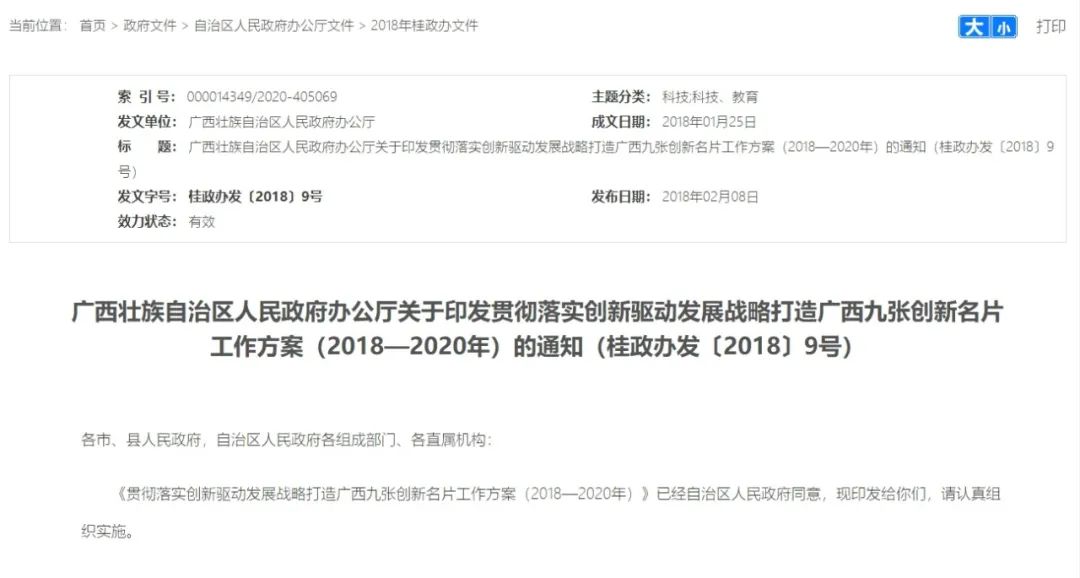 广西壮族自治区印发关于《贯彻落实创新驱动发展战略,打造广西九张创新名片工作方案》(桂政办发【2018】9号)。