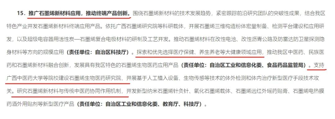 文件要求推广石墨烯材料应用,推动终端产品创新,探索石墨烯技术在大健康领域的应用,推动广西中医药、民族医药和石墨烯新材料融合创新,发展具有广西特色的石墨烯生物医药产品。
