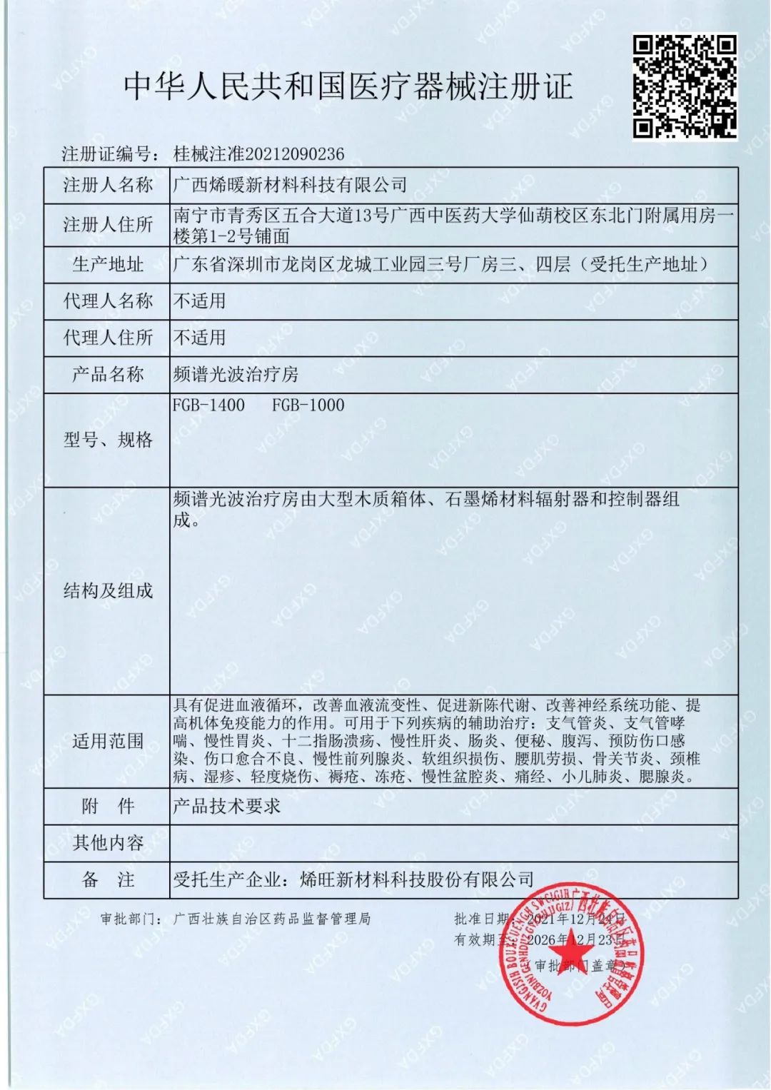 制定了大型医疗设备“频谱光波治疗房”技术指标并进行了产品试制,于2019年12月正式获得二类医疗器械注册认证。(注册证编号:桂械注准20212090236)