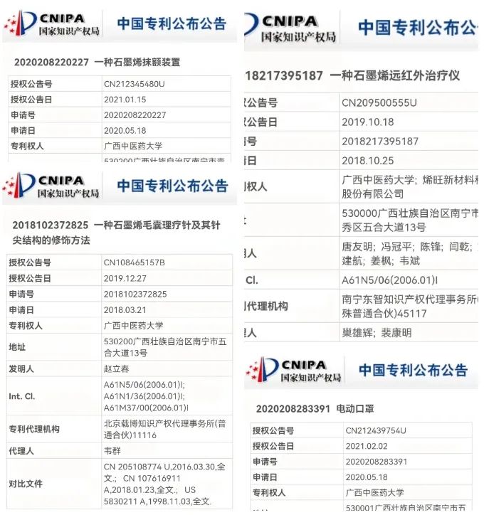 专利包括:石墨烯电动梅花针、一种毛发移植小针刀、一种石墨烯足部按摩仪、一种石墨烯远红外治疗仪、氧化石墨烯血栓去除盾构针及其制备方法等。