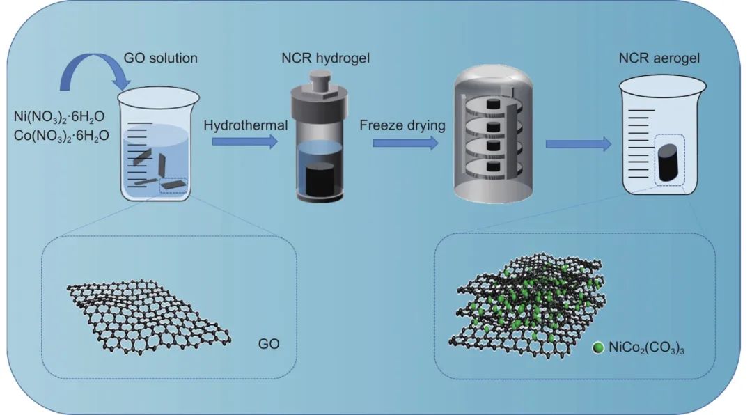 随着5G时代的到来,与日俱增的科技产品导致电磁辐射大幅度增长,对人体健康、生态环境和军事安全造成不同程度的危害。研究发现,CoCO3等碳酸盐或碱式碳酸盐拥有较宽的有效吸收带宽,然而,其阻抗匹配和衰减能力较低,电磁波吸收性能较差。而具有宏观三维互连多孔结构的轻质石墨烯气凝胶材料具有高电导率,超低比密度,大比表面积和丰富的官能团,能有效解决碳酸盐材料作为电磁波吸收材料阻抗匹配低以及颗粒易团聚等难题,有效延长电磁波传输路径,为电磁波的衰减提供了丰富的界面与极化位点,是制备高效微波吸收材料的理想选择。