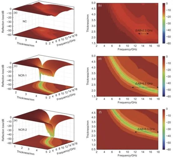 图2 NC、NCR-1和NCR-2在不同频率和厚度下的RLmin值