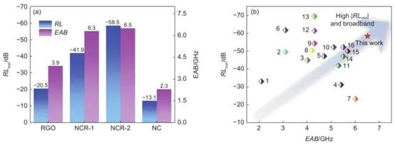 图3 (a) NC, NCR-1, NCR-2 和 RGO的RLmin与EAB对比图;(b) 所制备气凝胶与文献报道材料的性能对比