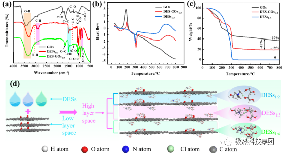 (a)GOs、DES-GOs1:3和DESs1:3的FTIR光谱,(b)DSC和(c)TGA曲线,(d)DES-GOS的制备机理图