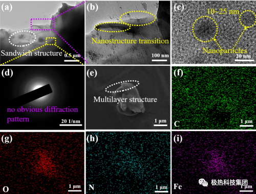 (a-c)DES-GOs1:3磨损碎屑的TEM图像,(d)电子衍射图,(e)SEM图像和(f-i)EDS映射(C, O, N, Fe)