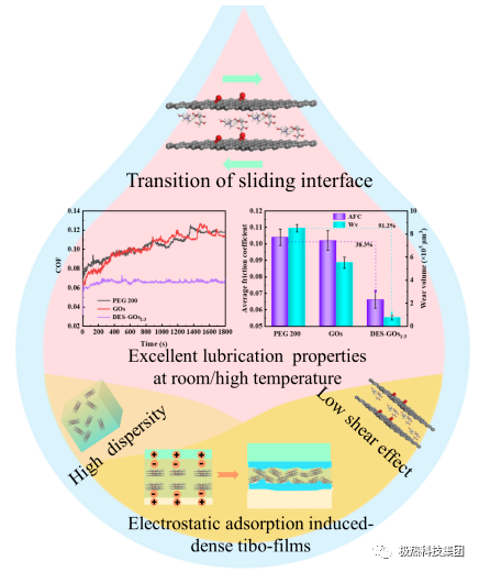 近日,极热科技研发团队极热集团董事长曹达平等以低共熔溶剂(由氯化胆碱和乙二醇制成)插层氧化石墨烯(DES-GOs)构筑了三明治结构的复合润滑添加剂,低共溶溶剂(DESs)与氧化石墨烯纳米片间以氢键网络链接;在PEG 200中分散稳定性优异,120 d无沉淀;导电性能优异的DES-GOs添加后,其平均摩擦系数和磨损体积比PEG200分别降低了38.2%和91.3%,这归功于功能化石墨烯的高分散稳定性、致密摩擦膜的形成、弱的层间剪切效应。