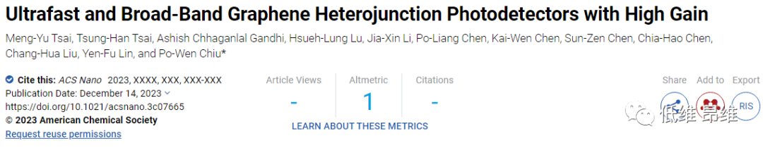 有鉴于此,近日,台湾国立清华大学Po-Wen Chiu教授等提出了一种设计的结构,将石墨烯与由WS2-WSe2交替条带超结构组成的光敏剂结合在一起。在光照下,n+-WS2和p+-WSe2条带在石墨烯中产生交替的电子和空穴传导沟道,有效地克服了响应率和开关时间之间的权衡。这种配置允许实现1.7×107 mA/W的响应率,外部响应时间为3-4 μs。超结构使光探测能够跨越从近紫外到中红外的宽范围,并在追求宽带探测时提供了用于高响应率和快速时间响应的独特光浮栅路线。文章以“Ultrafast and Broad-Band Graphene Heterojunction Photodetectors with High Gain”为题发表在著名期刊ACS Nano上。