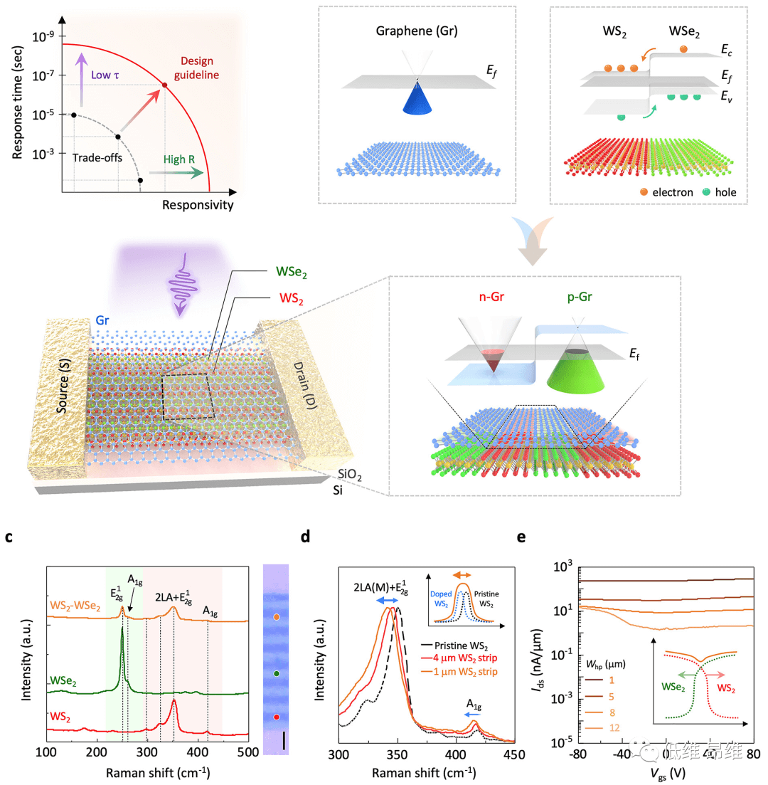 图1. 具有WS2-WSe2条带超结构的石墨烯光电探测器。(a)具有高增益的超快光电探测器的研制指南。(b)器件架构的示意图和能带图。(c)WS2-WSe2条带超结构的光学图像。(d)当比较原始和条带WS2的拉曼光谱时,发现WS2条带的光掺杂导致了2LA(M)+E2g1峰的蓝移。(e)平行于条带传导方向测量的WS2-WSe2超结构的转移特性。