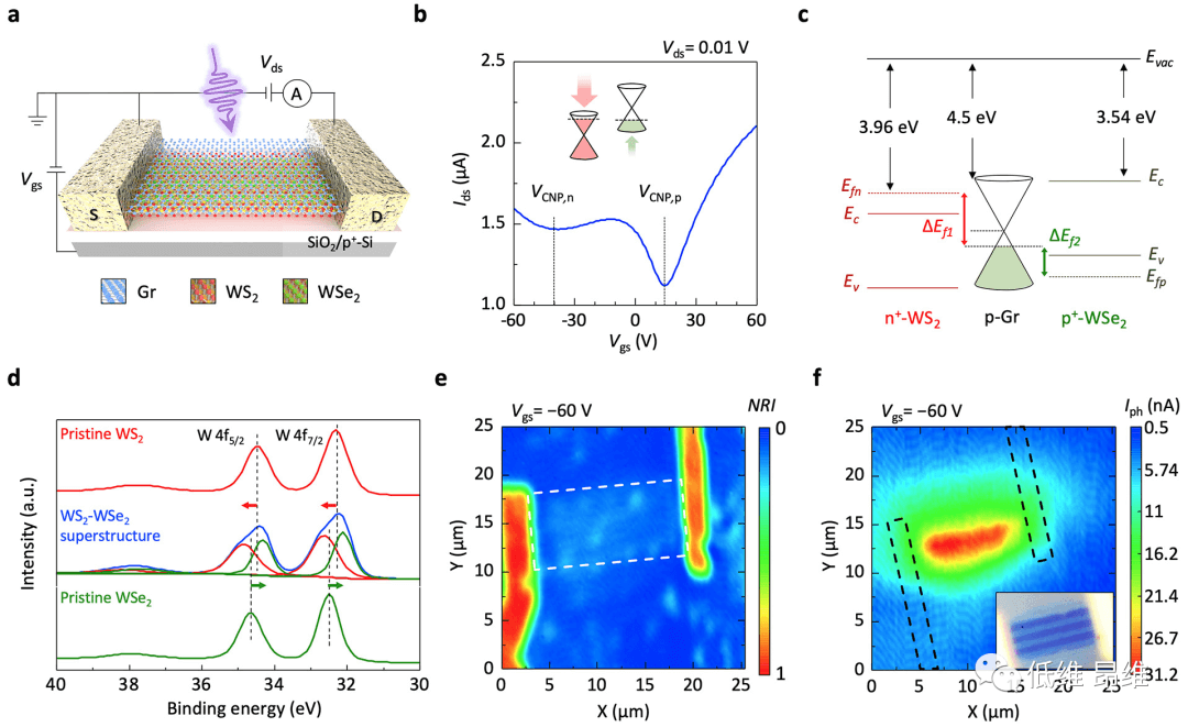 图2. 石墨烯光电探测器的层间电荷转移与扫描光响应。(a)石墨烯光电探测器的电学测量布局。(b)器件中石墨烯层的转移特性。(c)n+-WS2和p+-WSe2相对于石墨烯的能带对齐。(d)钨的核心能级结合能。(e&f)归一化反射图像(NRI)和光电流。