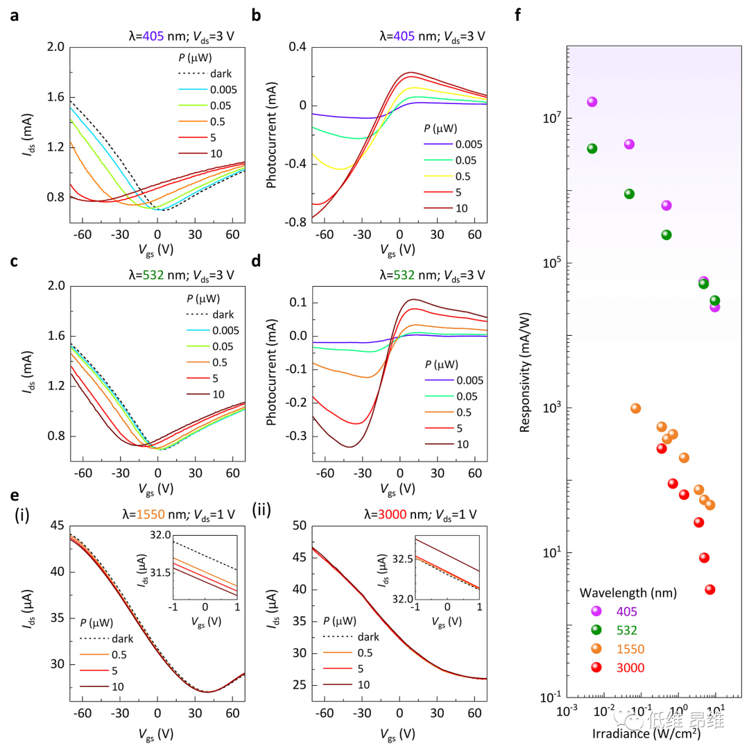 图3. 石墨烯光电探测器的光响应。(a-e)激发波长分别为405 nm、532 nm、1550 nm和3000 nm时,器件在不同光功率下的转移特性及对应光电流。(f)在不同的激发波长下,测量的光响应率与光照功率的关系。