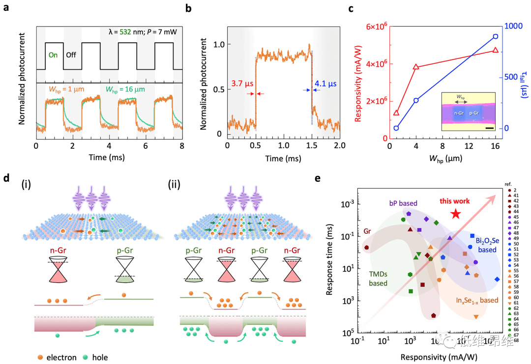 图4. 石墨烯光电探测器在可见光状态下的时间光响应。(a)Whp=1.0和16 μm时的循环开/关光照和相应的时间光响应。(b)光照的单开/关切换。(c)响应率和响应时间与Whp的关系。(d)p-n同质结石墨烯光电探测器中电子-空穴复合的示意图。(e)各种光电探测器的响应率和响应时间比较。
