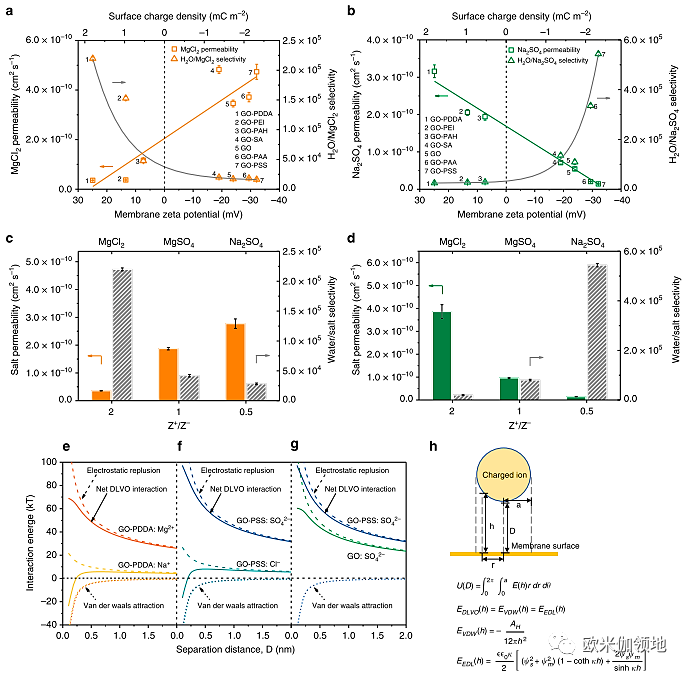 膜表面的电荷特性取决于水中胺基的质子化或磺酸基/羧基/羟基的去质子化,这可以通过这些可电离官能团的强度和数量进行微调。在聚合物电解质中,聚二烯丙基二甲基铵(PDDA)具有比聚乙烯亚胺(PEI)和聚烯丙胺盐酸盐(PAH)更强的质子化作用,表面电荷密度为+1.8 mC·m−2;同样,聚苯乙烯磺酸(PSS)具有比聚丙烯酸(PAA)和海藻酸钠(SA)更高的去质子化作用,表面电荷密度为-2.32 mC·m-2(图1e)。膜表面电荷密度相对于附着的聚电解质的zeta电位具有相同的顺序,表明聚电解质的电荷特性可以通过简单的涂覆方法轻松地转移到GO膜表面。