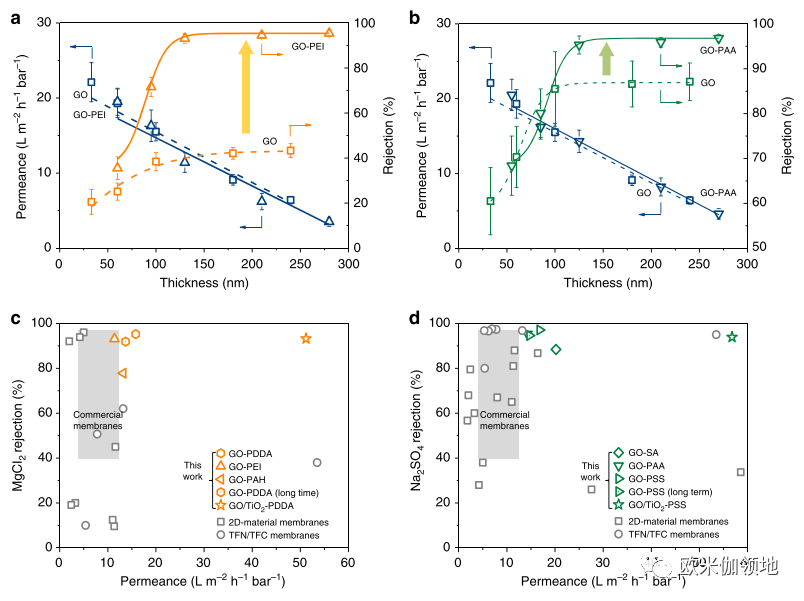 表面带电GO膜展现了对离子传输的巨大潜力,因此研究人员决定验证其应用于纳滤工艺中的表现。原始GO和表面带电GO膜的分离性能测试结果(图3a,b)表明,原始的GO膜允许快速水传输,但由于GO层压板的层间距离限制无法从水合半径约4.7 Å 的急剧渗透截断处筛出水中的盐。而带正电荷的GO-PEI膜表现出高达95%的MgCl2截留率,是原始GO膜的2.3倍。同样,原始GO膜的最高Na2SO4截留率约为86%,在带负电的GO-PAA膜中可进一步增加至约96%。此外,与传统混合方法制备相比,浸涂法制备的表面带电的GO膜的水渗透率几乎没有下降,GO层压板内的快速水渗透通道得到了很好的保持,因此有望实现GO纳米通道的独立优化,以进一步促进水的传输。