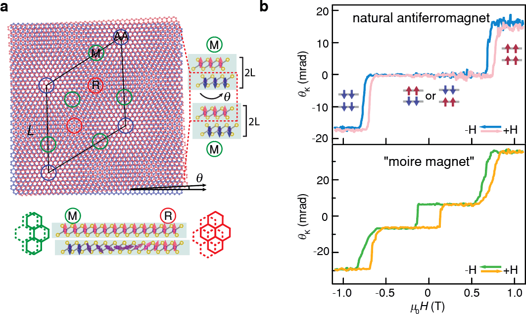 “我们把一个反铁磁体堆叠并扭曲到自己身上,然后就得到了一个铁磁体,”Cheng说。”这也是最近在扭曲的二维材料中出现的’扭曲’或摩尔磁性领域的一个突出例子,两层材料之间的扭曲角度提供了一个强大的调谐旋钮,极大地改变了材料的特性。”