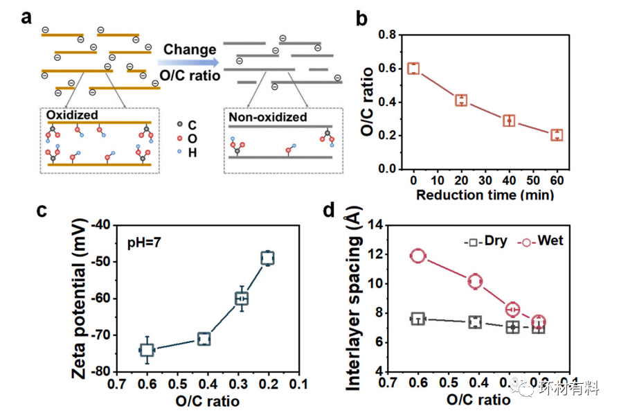 (a)具有不同O/C比的GO膜的示意图,(b)具有不同氧化程度的GO膜的O/C比,(C)pH = 7时GO膜的表面zeta电势,(d)不同GO膜在干态和湿态下的层间间距。