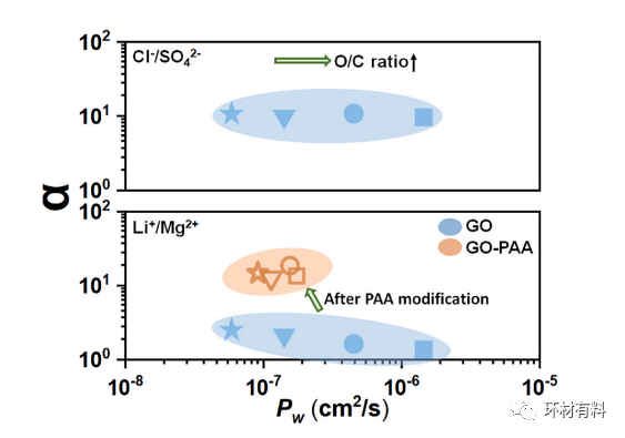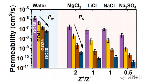 GO和GOPAA膜的水渗透性和离子/离子选择性概述。