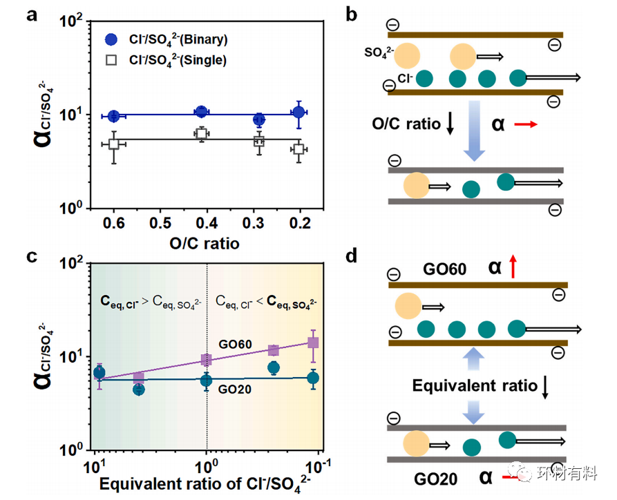 (a)离子/离子选择性,和(b)具有不同O/C比的GO膜的阴离子对的示意图,(c)离子/离子选择性,和(d)具有不同进料溶液的GO60和GO20膜的示意图。Cl–和SO42–的电荷当量浓度比为9/1、4/1、1/1、1/4和1/9。