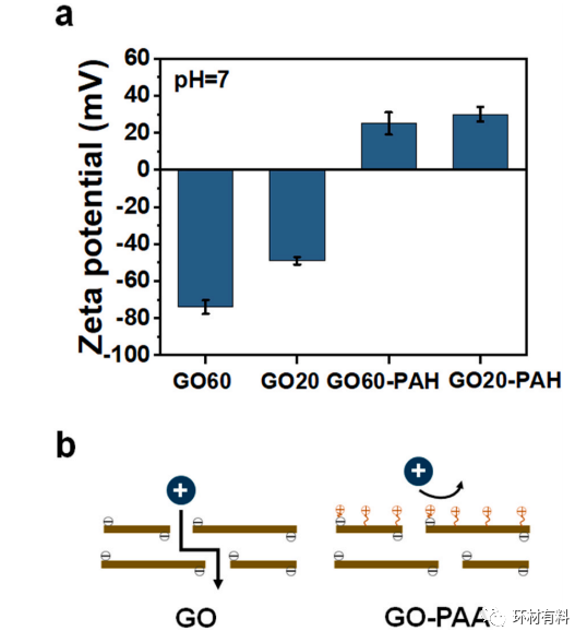 (a)zeta电势和(b)PAA改性前后GO膜的静电相互作用示意图。