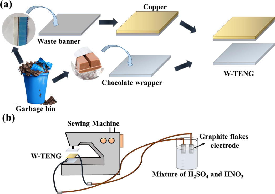 图1.(a) W-TENG逐步制备示意图;和(b)石墨烯的机械电化学剥离辅助合成的装置示意图。