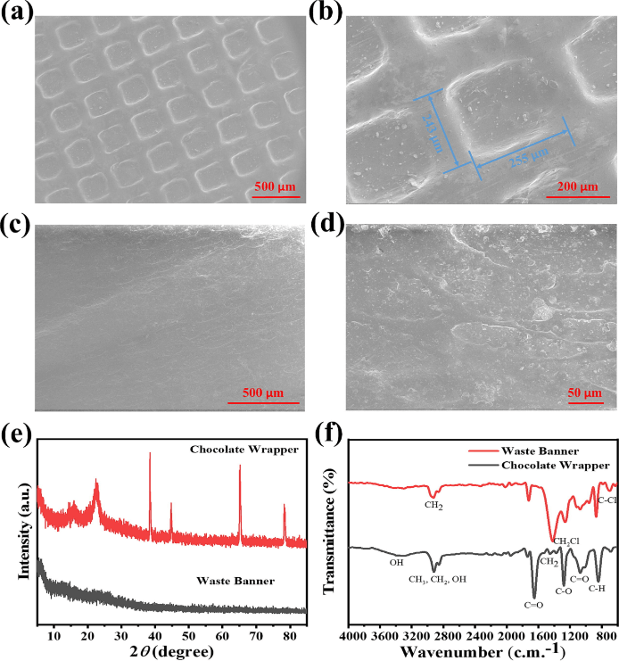 图2.(a) SEM图像和(b)巧克力包装物的SEM图像的放大图;(c) SEM图像和(d)废塑料横幅的SEM图像的放大图;(e) 巧克力包装和废塑料横幅的XRD图谱;以及(f)巧克力包装物和废塑料横幅的FTIR光谱。
