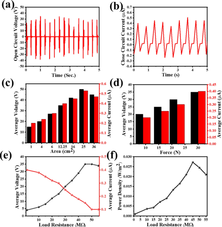 图3. W-TENG的输出(a)开路电压(Voc)和(b)短路电流(Isc);W-TENG通过变化的平均电压和电流,(c)有效面积,W-TENG的输出(d)力;PTNG在照明条件下不同负载电阻下的输出(e)平均电压和电流,以及(f)功率密度。