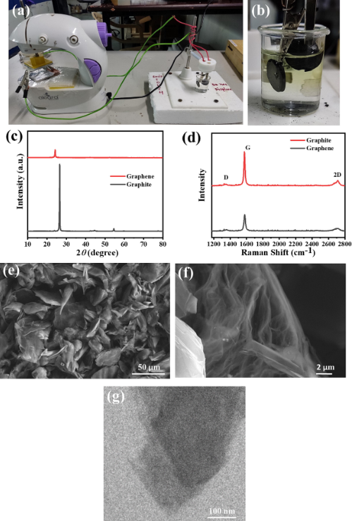 图5.(a) 机械电化学剥离实验装置的实物图,包括缝纫机的W-TENG和基于石墨片的电极和酸性电解质的电化学装置;(b) 烧杯的放大图像,其中包含电化学设置;(c) 石墨和石墨烯的XRD图谱;(d) 石墨烯的拉曼光谱(e)石墨烯的SEM图像;(f) 石墨烯的高分辨率SEM图像;和(g)石墨的TEM图像。