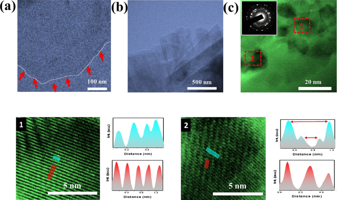 图6.(a)单个石墨烯片和(b)堆叠在一起的石墨烯纳米片的TEM图像;(c) 石墨烯纳米片的大面积HRTEM(插入:SAED图案),具有两个激发区和原子间距离。
