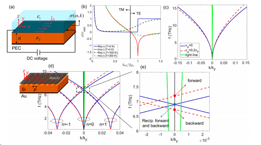 图1 (a)支持漂移电子的石墨烯片。纵向电压在介电常数为ϵ1的半无限介电介质和介电常数为ϵ2的接地介电介质之间的石墨烯层中诱导电子漂移(PEC表示完美的电导体)。(b)石墨烯在室温、T = 300 K和T = 0 K时的电导率。(c)石墨烯层支撑的SPPs在不同漂移速度下的色散图。 (d)光栅周期性P = 0.7 μm的光栅硅衬底上石墨烯片支撑的SPPs色散图。 (e)图(d)围绕光线(绿色实线)的放大视图。
