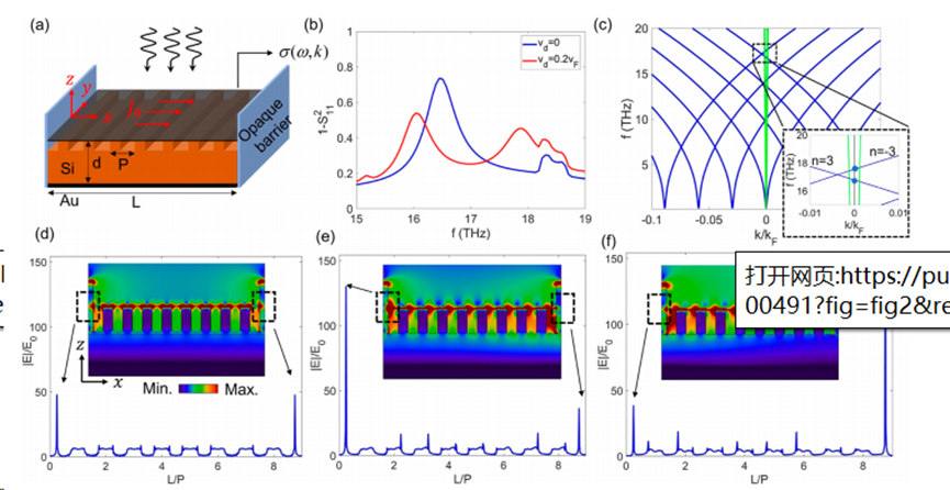 图2。(a)结构示意图。(b)吸收随两个vd值的入射频率的函数。随着vd的增大,SPP共振峰分成两个不同的共振峰。(c)由石墨烯片支撑的SPPs在横向无限的硅衬底光栅上的色散图。插图显示了光线(绿色实线)周围的放大视图。(d−f) (d)无偏置情况下,(e)电流偏置,低频峰,(f)电流偏置,高频峰,石墨烯片吸收峰频率处的电场大小分布。插图分别显示了每种情况下xz平面上电场大小的空间分布。