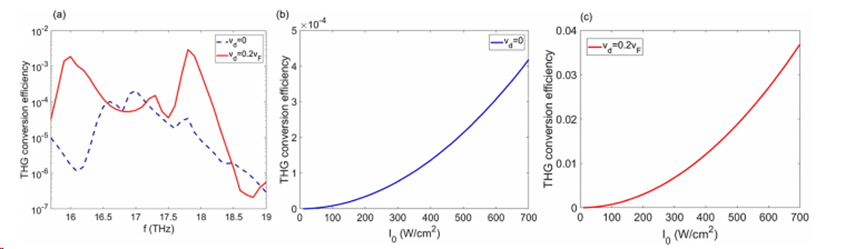 图3。(a)图2a中vd = 0和vd = 0.2vF石墨烯结构的THG转换效率与入射频率f的关系。(b) vd = 0和(c) vd = 0.2vF情况下,THG转换效率作为输入强度的函数。