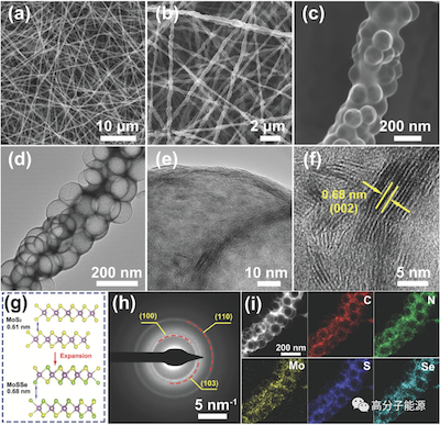 MoSSe/rGO-NPCF(D≈2.5) 膜的 a–c) SEM 图像,d,e) TEM 图像和 f) HR-TEM 图像。g) MoS2和MoSSe的结构模型。相应的h)SAED图和i)HAADF图以及C、N、Mo、S和Se的EDS元素映射图。