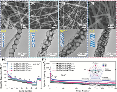 a–d)MoSSe/rGO-NPCF(D≈1)、MoSSe/rGO-NPCF(D≈1.5)、MoSSe/rGO-NPCF(D≈2.5)和MoSSe/rGO-NPCF(D≈5)膜的SEM图像和相应的TEM图像。e)电极的倍率能力和 f)循环性能。f):MoSSe/rGO-NPCF与不同D值的特征相关性。