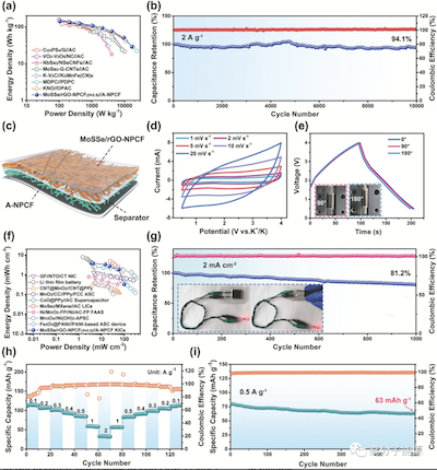 a) MoSSe/rGO-NPCF//A-NPCF KICs与已报道的KICs的Ragone图比较。b) KIC在2 A g−1时的循环稳定性。c) 柔性MoSSe/rGO-NPCF//A-NPCF KICs示意图。d) 不同扫描速率下柔性KIC的CV曲线。e) 柔性KIC在不同弯曲角度下的GCD曲线。f) 柔性KIC的Ragone图与文献结果的比较。g) 柔性KIC在2 mA cm−2下的循环稳定性。h) MoSSe/rGO-NPCF(D≈2.5)//EG KDIBs的倍率能力。i) KDIBs在0.5 A g−1下的循环稳定性。