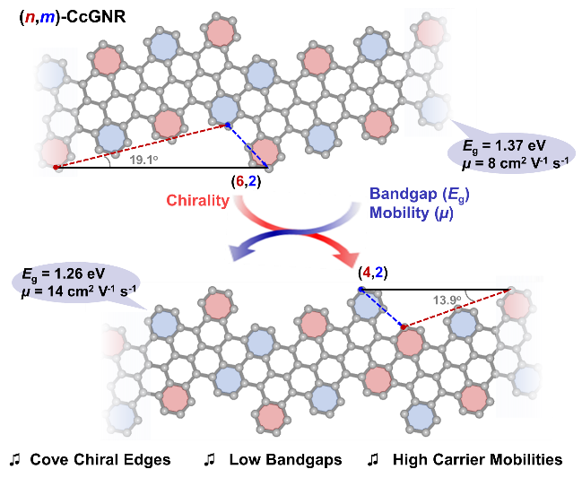 原子级精度的石墨烯纳米带(Graphene Nanoribbon, GNR)因其高度可调的带隙和电子结构,在晶体管、量子电子器件以及有机光电子学等领域展现出巨大的应用潜力而备受瞩目。除了通过调节宽度和边缘拓扑结构,改变石墨烯纳米带的手性矢量(n,m)也可以实现对其带隙和光电物理性质的进一步调控。此外,手性纳米带被期望具有手性依赖的光电特性和自旋极化边缘态等独特物理性质。然而,迄今为止,由于缺乏高效可行的合成策略以及锯齿型(zigzag)边缘结构固有的不稳定性,关于在溶液中精准合成具有手性边缘结构的石墨烯纳米带(chiral GNR, cGNR)的研究仍面临巨大挑战。