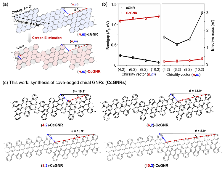 图1.(a)获得海湾型手性纳米带的周期性“碳消除策略”;(b)DFT计算的不同手性纳米带的带隙和有效质量对比;(c)海湾型手性纳米带的化学结构。图片来源:J. Am. Chem. Soc.