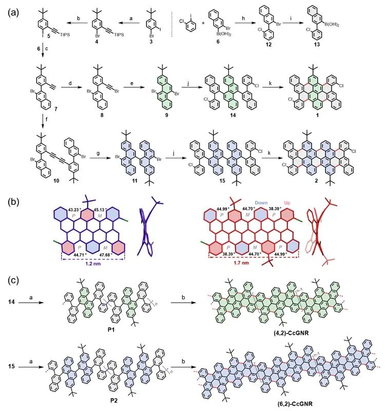其次,为验证所提出的策略的可行性,作者成功合成了相应的模型化合物1和2(图2a),并通过单晶X射线衍射分析证实其扭曲的海湾型边缘结构(图2b)。此外,通过Yamamoto偶联聚合和随后的肖尔反应,两种不同尺寸的单体14和15分别被成功构造为目标纳米带(4,2)-CcGNR和(6,2)-CcGNR(图2c)。