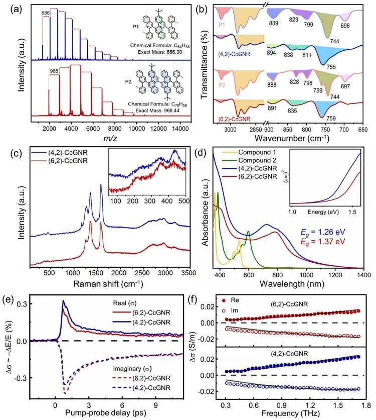 图3.(a)聚合物前驱体P1和P2的MALDI-TOF 质谱;(b)红外光谱;(c)拉曼光谱;(d)紫外-可见光吸收光谱;(e),(f)超快太赫兹光谱。图片来源:J. Am. Chem. Soc.