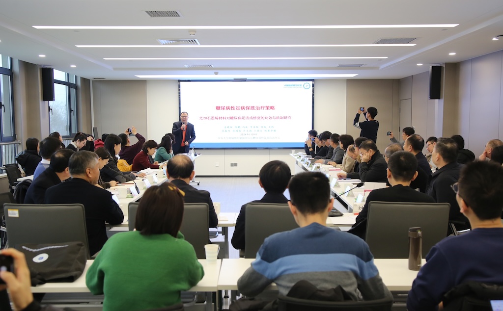 会上,药物研究院负责人向与会专家介绍了石墨烯医学研究院工作进展情况。青岛大学附属烟台毓璜顶医院手足外科、糖尿病足防治诊疗中心主任医师姜晓锐,我校药物研究院高燕,长青烯旺(山东)医学科技有限责任公司董事长徐祥圣分别就石墨烯对糖尿病足溃疡修复的功效与机制、石墨烯在疾病防治中的8个基础研究课题进展、石墨烯医疗设备的进展情况和未来发展规划作专题报告。