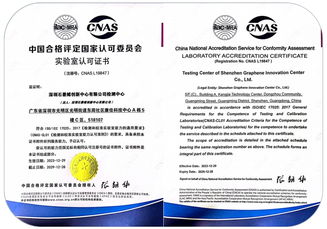 近日深圳石墨烯创新中心有限公司检测中心实验室荣获CNAS(中国合格评定国家认可委员会)的认可,符合ISO/IEC 17025标准的要求,标志着我公司实验室在管理水平和技术能力上达到国际(内)同行业先进水平。