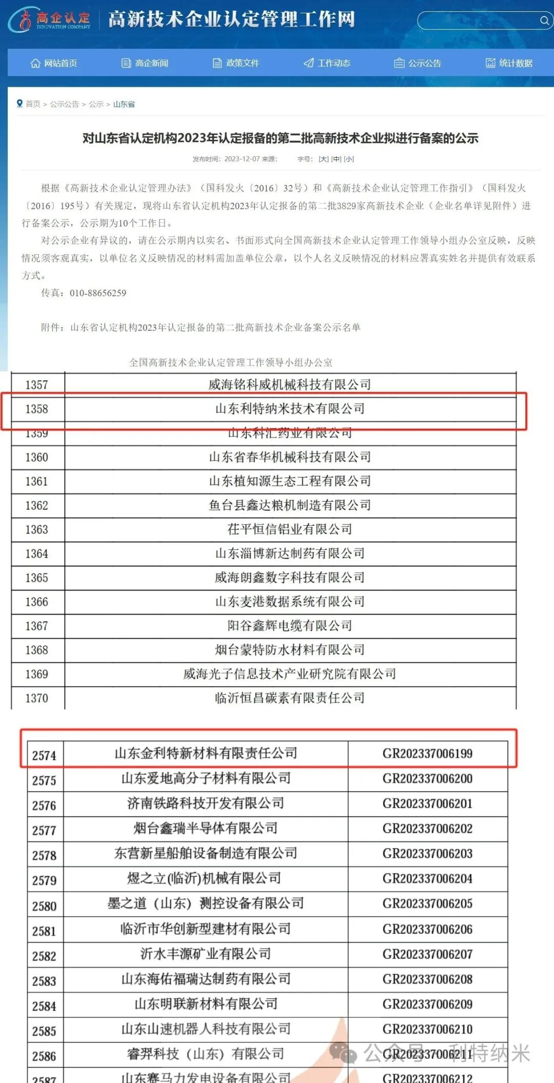 2023年12月,利特纳米及金利特再次通过国家高新技术企业认定。