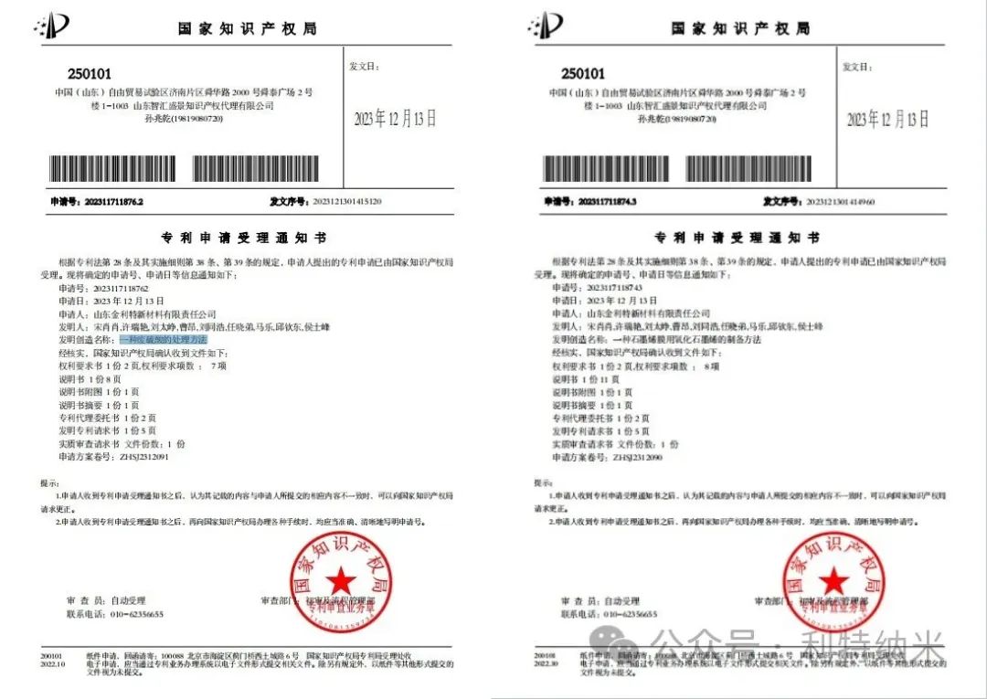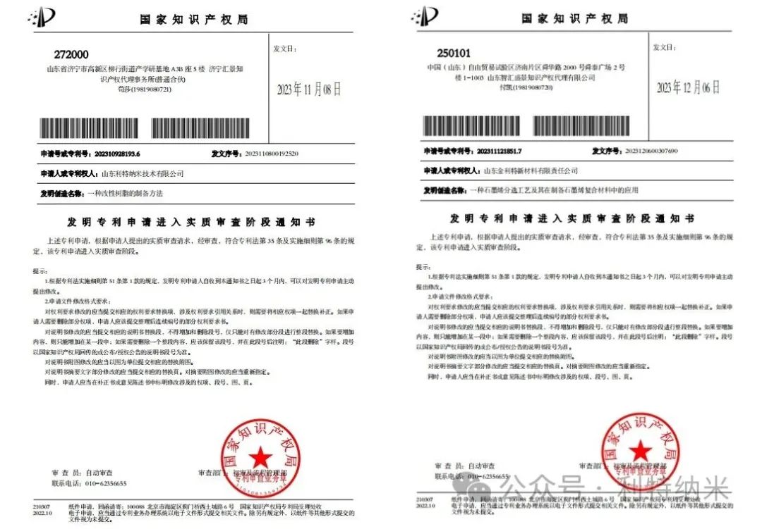 本季度公司两项发明专利《一种改性树脂的制备方法》、《一种石墨烯分选工艺及其在制备石墨烯复合材料中的应用》进入实审阶段;新受理两项发明专利《一种废硫酸的处理方法》、《一种石墨烯膜用氧化石墨烯的制备方法》。