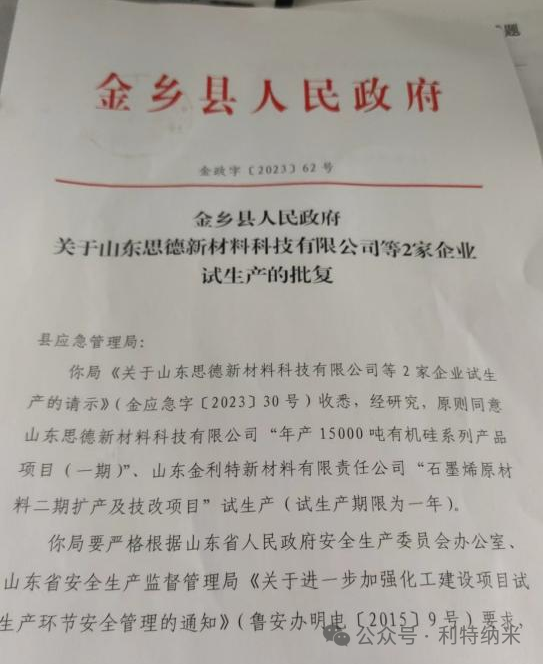 2023年11月,公司首条全闭环生产线获金乡县人民政府试生产批复。