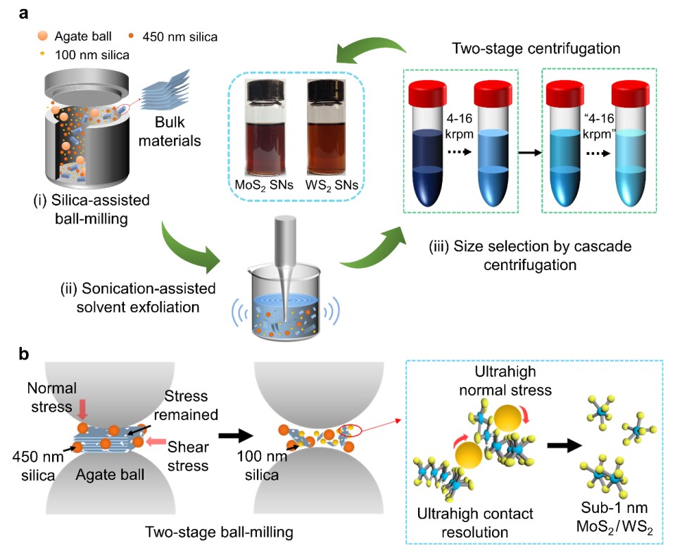 中国科学院国家纳米科学中心张勇团队致力于极小尺度材料的物理制备及性能研究。前期,提出了二元协同球磨方法,将球磨极限推进至量子尺度;开发出全物理方法,实现了量子尺度材料的普适和规模制备。相对于狭义方法(盐辅助球磨),广义方法(硅球辅助球磨)具有更多优势。层状材料、非层状材料、非平面层状材料、非范德华层状材料等都能够通过广义方法达到量子尺度。性能研究方面,研究人员揭示了材料性能(荧光、非线性光学、电催化、载流子动力学)随材料尺寸的变化规律;实现了(可见光波段)最高纪录的非线性饱和吸收性能,以及非线性饱和吸收的超高响应与超低功率激发。