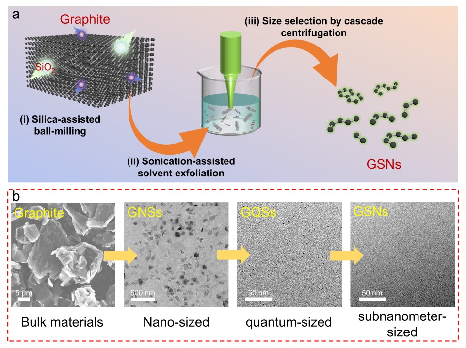 近日,该团队与合作者提出了三元协同球磨方法,将球磨极限推进至亚纳米尺度,实现了亚纳米材料的普适制备。研究人员以过渡金属二硫族化合物为研究对象,确立了三元协同球磨方法的有效性。单次循环制备产率分别为7.2 wt%(二硫化钼)和4.8 wt%(二硫化钨)。所得亚纳米二硫化钼/二硫化钨横向尺寸约为0.44nm和0.47nm,厚度约为0.55nm和0.61nm,从而证实了其亚纳米尺度。与纳米尺度和量子尺度相比,亚纳米尺度能够极大提升材料的荧光和非线性光学性能。该研究以石墨为研究对象,确立了三元协同球磨方法的普适性;同样操作,单次循环制备产率为2.3 wt%,所得亚纳米石墨烯横向尺寸约为0.54nm,厚度约为0.37nm,从而证实了其亚纳米尺度(破缺单胞状态)。考虑到上述制备策略的机械/力学属性以及单层石墨烯具有已知最高断裂强度,亚纳米石墨烯的成功制备证明了这一策略的高度普适性。亚纳米材料普适制备的实现,展示了自上而下物理制造的极限能力以及破缺晶格的真正潜力,为研究非平衡亚纳米材料的性质和相互作用奠定了重要基础,有望促进亚纳米材料的规模制备和全面开发。