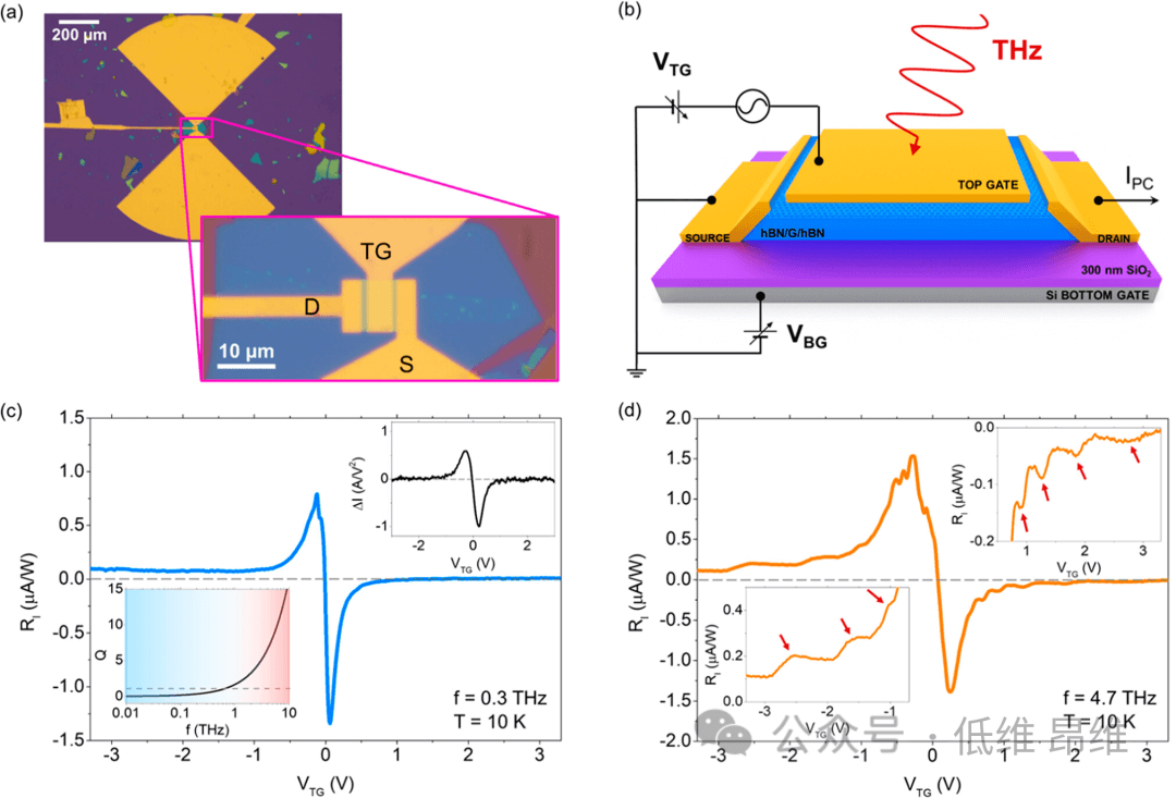 有鉴于此,近日,西班牙萨拉曼卡大学Juan A. Delgado-Notario等展示了在高质量单层石墨烯制成的短沟道栅控光电探测器中对THz辐射的室温共振探测。这种有趣的谐振状态在室温下的存在最终依赖于单层石墨烯中弱的本征电子-声子散射,这避免了器件沟道中存在的等离激元振荡的阻尼。